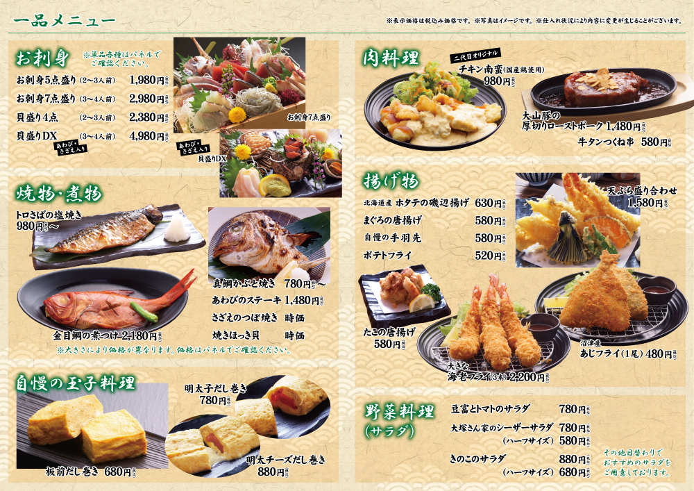 一品料理には天ぷらやお刺身、海鮮のフライなどがあります。