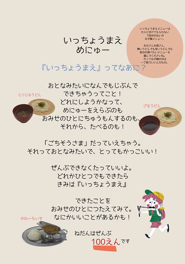 メニューは一丁前ざるうどん・一丁前とりじるうどん・一丁前カレー