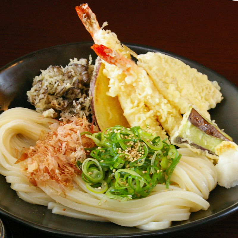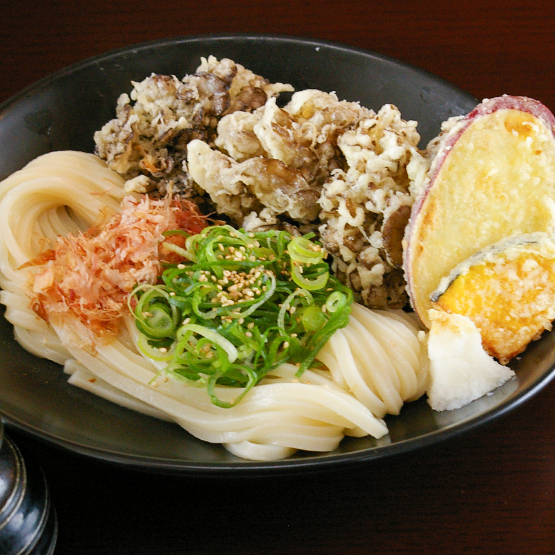こめ油使用でカラリと揚がった天ぷらが、うどんとの相性抜群。サクッとした食感も楽しめます。特に舞茸が人気!
